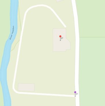 On the map the red pin is the house. The purple pin is the entrance gate to enter the drive which will take you round to the front of the house.